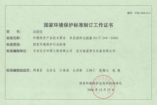 制訂多層濾料過(guò)濾器標(biāo)準(zhǔn)工作證